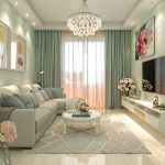 ترکیب یک مبل ال طوسی روشن با فرش کرم و پرده سفید، فضای کوچک را بسیار روشن‌تر و دلبازتر نشان می‌دهد.
